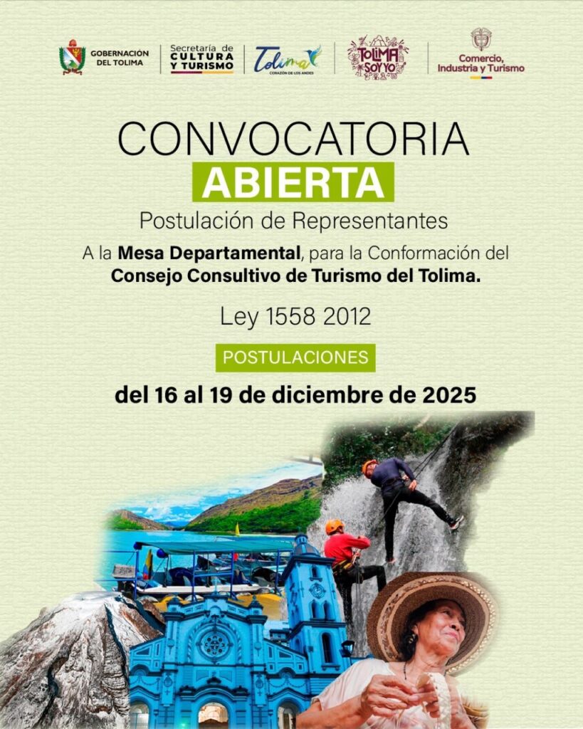 La Secretaría de Cultura y Turismo del Tolima, a través de la Dirección de Turismo y con el acompañamiento del Viceministerio de Turismo, abrió la convocatoria para la postulación de representantes a la Mesa Departamental de Turismo, un espacio clave en la conformación del Consejo Consultivo de Turismo del departamento.