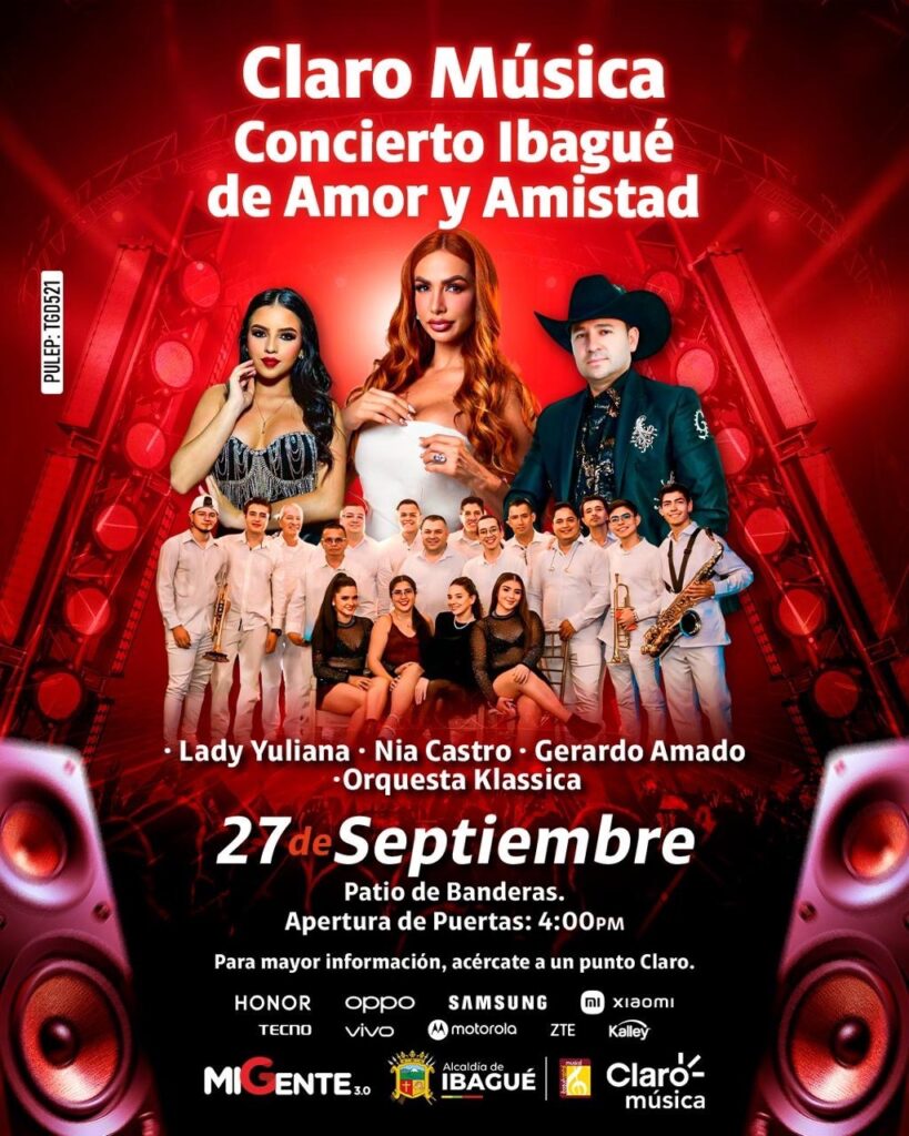 La Alcaldía de Ibagué anunció la realización del Concierto Ibagué de Amor y Amistad, un evento gratuito que reunirá a destacados artistas nacionales este sábado 27 de septiembre en el Patio de Banderas de la Unidad Deportiva de la 42, desde las 4:00 de la tarde.